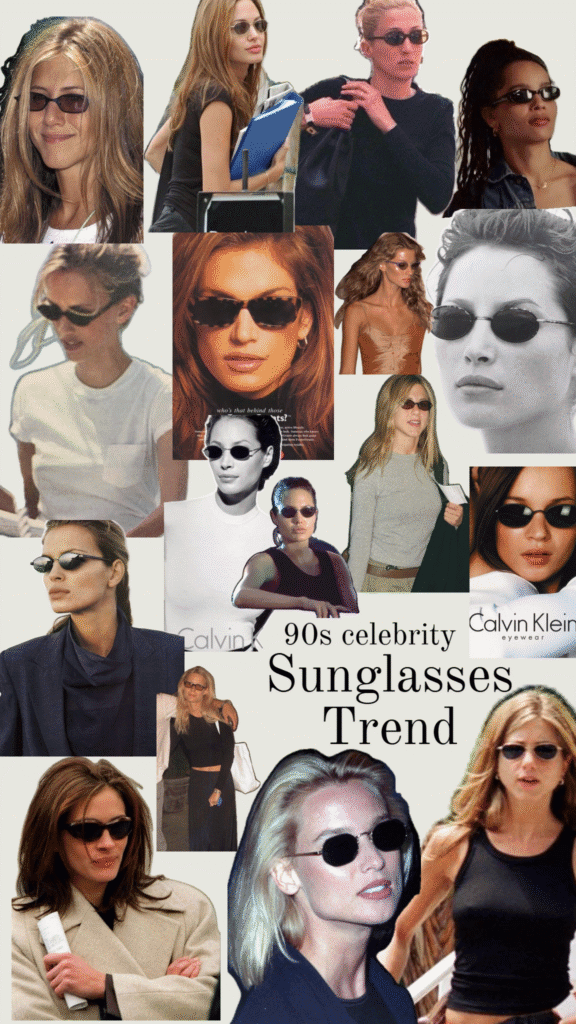 The trend of tiny sunglasses is a direct throwback to the 1990s, where fashion shifted from the oversized styles of the 1980s to an aesthetic of minimalism, sleekness, and subtle cool. Wearing tiny sunglasses was associated with an effortless, edgy, and confident attitude, o”ften seen in the “model off-duty” look.